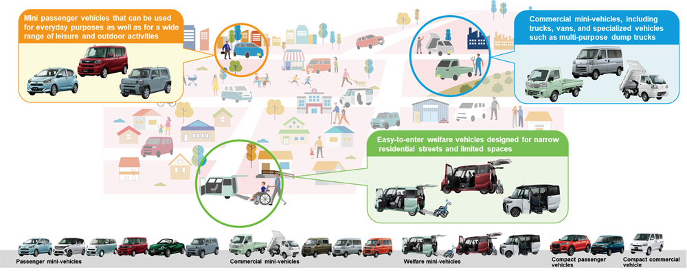 With their compact body size that’s easy to maneuver on Japan's narrow roads and excellent fuel efficiency, mini-vehicles truly function as a "lifeline," supporting daily activities and work.