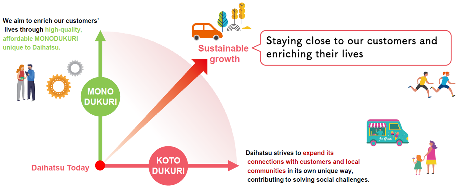 Guided by the mission "Staying close to our customers and enriching their lives," we aim for sustainable growth by advancing our business through both "MONODUKURI" and "KOTODUKURI," allowing these two aspects to uplift each other.