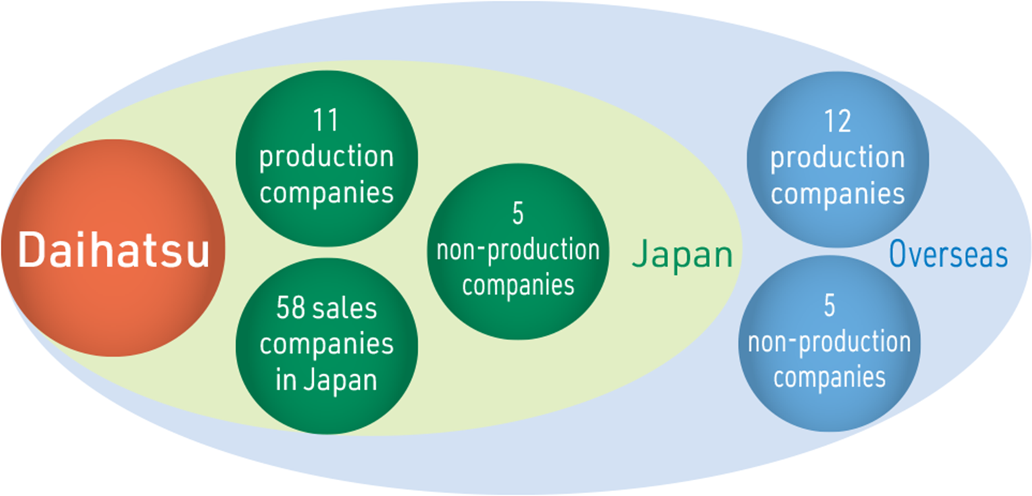 The environmental loads generated by Daihatsu’s business activities includes those from subsidiaries and business partners; for this reason, the entire Daihatsu Group must implement environmental conservation activities. We categorize affiliated companies based on their capital relationship and business type, and promote environmental management for the entire Group accordingly. As a specific measure, Daihatsu hosts Group-wide environmental liaison meetings twice a year in principle to encourage Group companies to share various forms of environmental information and to facilitate Group companies learning from one another. Going forward, we will shift from Japan-centric meetings to global environmental meetings.