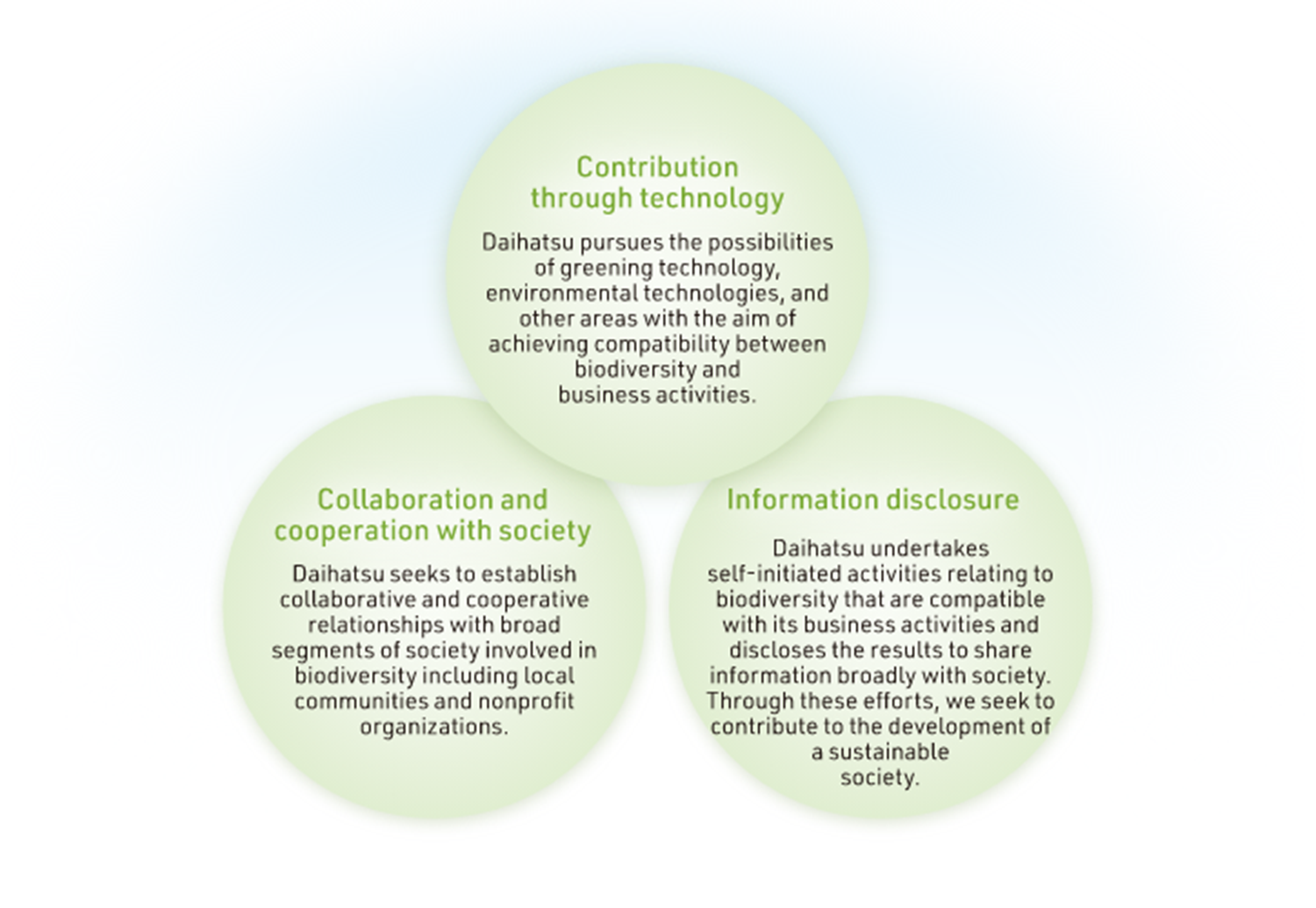 Based on an awareness of the importance of biodiversity, Daihatsu takes action to address biodiversity in accordance with the Daihatsu Sustainability Basic Policy in areas such as the automotive and related businesses and contribute to solutions to social issues with the aim of creating a livable earth and prosperous society and achieving their sustainable development.