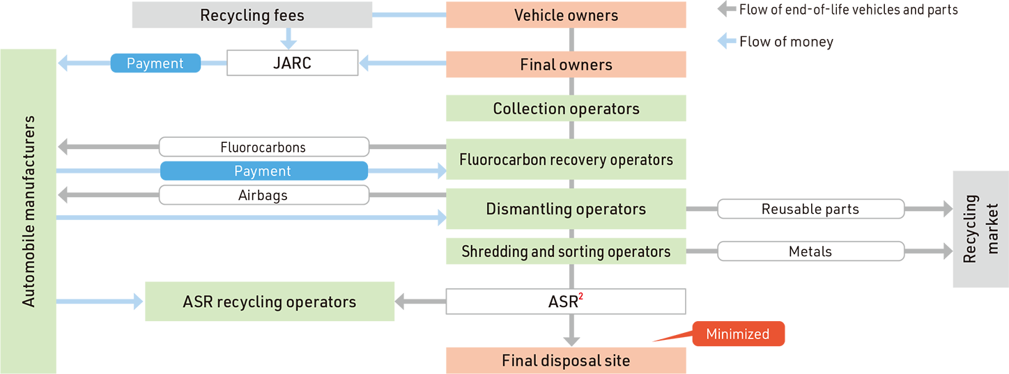 Daihatsu recovers and recycles airbags and fluorocarbons (fluorocarbons are destroyed) in an efficient manner through the Japan Auto Recycling Partnership—an organization established together with other automobile manufacturers to recover and recycle such items. We also recover and recycle shredder dust through Toyotsu Recycle Corporation’s ASR Recycling Business Department, which was jointly established by Daihatsu, Toyota Motor Corporation, Honda Motor Co., Ltd., and Hino Motors, Ltd.
