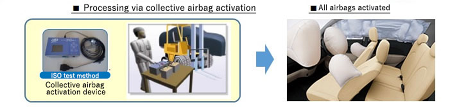 Daihatsu equips all of its vehicles with airbag collective activation connectors, which enable all airbags in a vehicle to be simply activated without having to be removed. We also provide registered vehicle dismantling companies with instructions on how to dismantle and activate airbags in a simple and safe manner via our online Proper Airbag Processing Manual.
