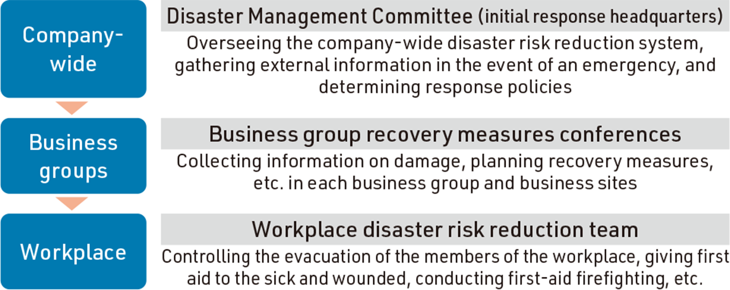 In particular, as part of our initial response in the event of a disaster, we have established a company-wide Disaster Management Committee that involves all divisions within the company. We also register information on the safety of employees from the website, telephone, mobile app, and other sources into the system. In doing so, we have created a safety confirmation system that allows the company and workplace supervisors to quickly confirm the safety of employees. We have also created a disaster prevention manual that outlines the standards for employee behavior in the event of a major disaster, as well as initial response and recovery procedures. By clarifying the process from the occurrence of a disaster to recovery and working to instill these procedures through training, we are working to build a corporate structure that is resilient to disasters.