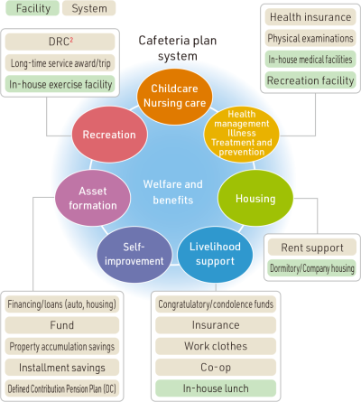In order to become a “company where employees are happy and the No. 1 place where people want to work,” we strive to ensure that Daihatsu has the facilities and equipment needed for people to work with peace of mind, lifestyle support policies that all ages of employees are happy to have, and to expand the choices available based on individuals’ diversifying preferences. We are also focused on improving employees’ welfare and benefits literacy, making systems design and availability as easy-to-understand as possible so that they can make appropriate use of those systems.