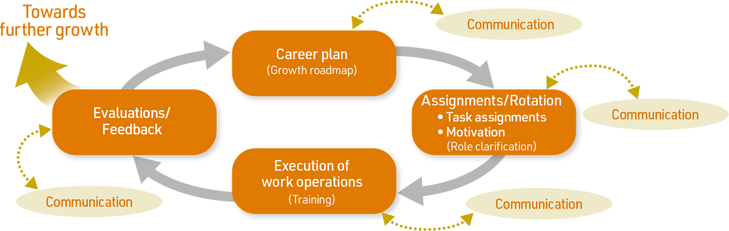 The roles and themes of the operations of Daihatsu employees are passed on to division/department policies from corporate policies and are set as individual goals based on these policies. Daihatsu aims to support each and every employee in continuing to challenge themselves and grow with peace of mind by building a personnel development cycle (formulating growth roadmap > clarifying roles > training through work > reflection) based on supervisor-subordinate communication.