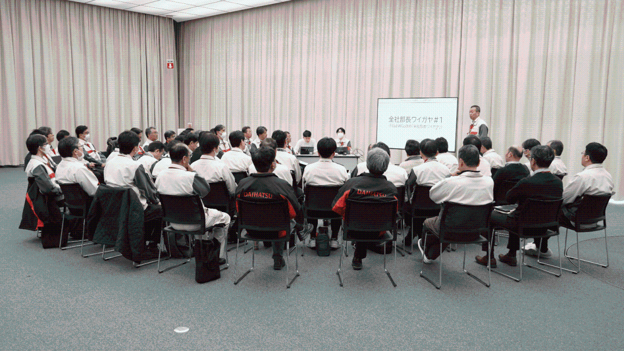 Company-wide General Manager Waigaya Meetings continue to serve as a venue for discussions about communicating and resolving management challenges from a frontlines perspective, forging a path for Daihatsu’s future.