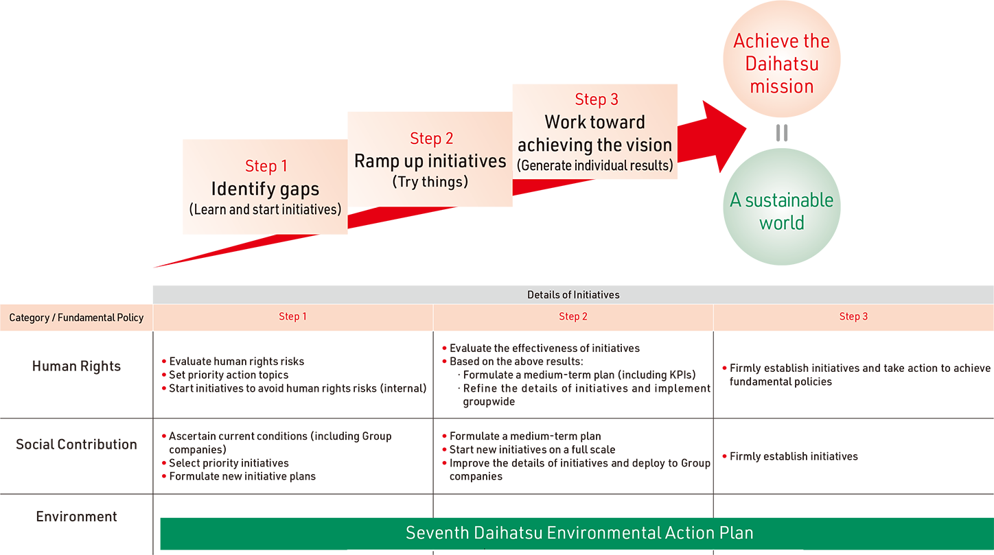 To achieve our mission of staying close to customers and enriching their lives, we believe implementing the three steps described below will lead to the realization of a sustainable world that leaves no one behind.