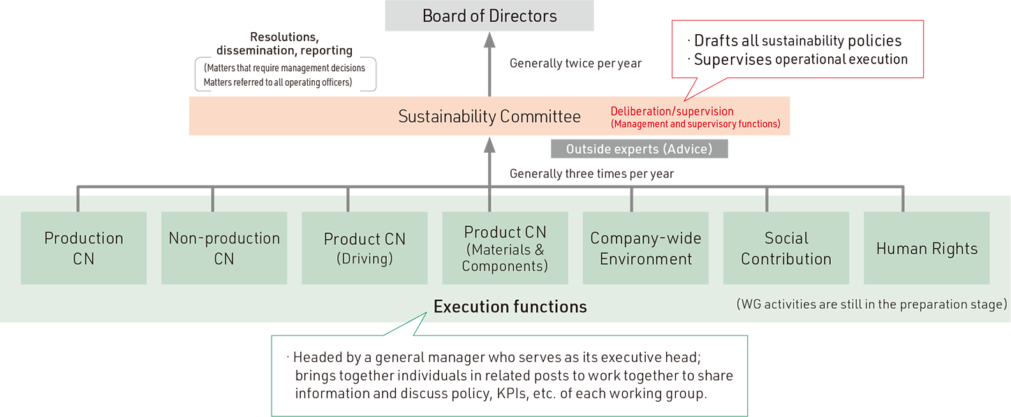 As the automobile industry undergoes what is said to be a once-in-a-century transformation and companies strongly need to contribute to solving social issues including respect for human rights and environmental conservation, Daihatsu has set up a Sustainability Committee and working groups (WG) with operational execution functions to enable the steady implementation of sustainability initiatives in response to those demands.