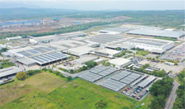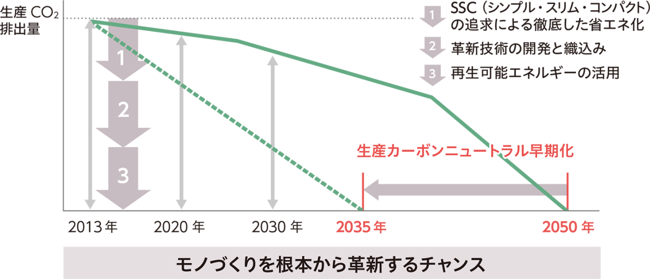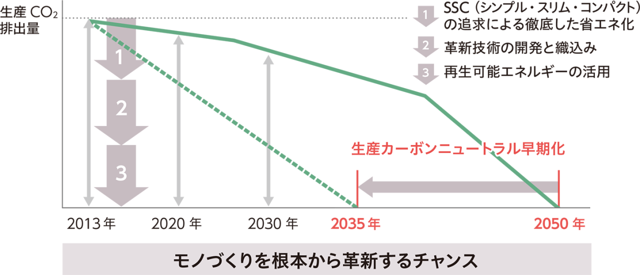 ダイハツグループは、世界的な課題である低炭素社会構築に一層貢献するべく、従来2050年をターゲットにしていた「生産カーボンニュートラル」の実現をトヨタグループの一員として大きく前倒しし、2035年に達成する目標を新たに掲げました。ダイハツ工業および子会社の生産工程※から排出されるCO2の削減を進め、2035年までに生産カーボンニュートラル実現を目指します。この高い目標を達成するために、2022年1月に専門組織として「生産・物流カーボンニュートラル推進室」を設け、「SSC(シンプル・スリム・コンパクト)の追求による徹底した省エネ化」「革新技術の開発と織込み」「再生可能エネルギーの活用」の三本柱活動として取り組んでいます。2022年10月に京都(大山崎)工場はリファインを行い、モデル工場としました。また、2024年にはこれまでに培った技術やノウハウを織り込み、インドネシアのカラワンにカラワン車両工場第2ラインを立上げました。今後も技術・ノウハウを国内外に展開し、グループ全体で生産カーボンニュートラル実現に向けた取組みを推進していきます。