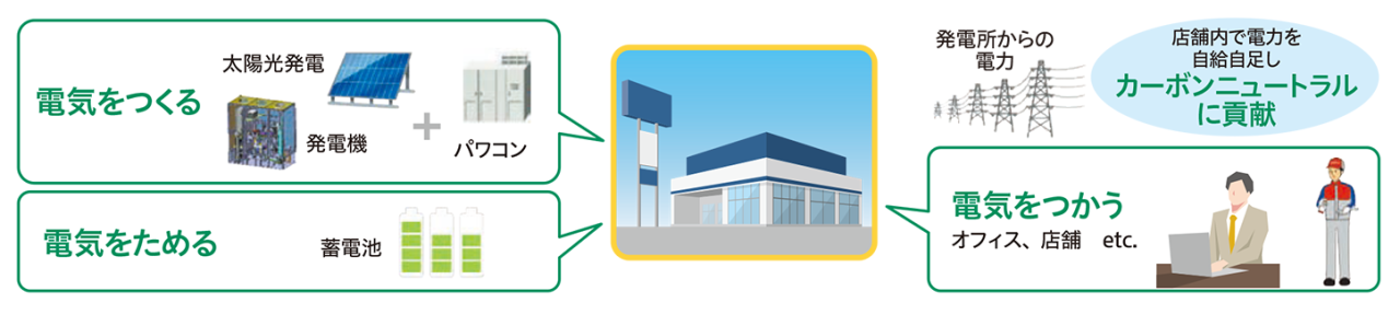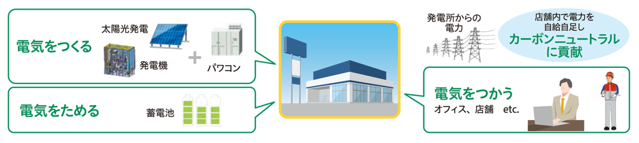販売会社などの中~小規模店舗のCO2排出削減への貢献を目指して、太陽光発電などの再生可能エネルギーを最大限活用できる電力変換システムとして、マイクログリッド・高効率パワーコンディショニングシステム(パワコン)を開発しています。このシステムでは、一般的な市販品と比べてエネルギーロスが低減されます。車載技術および部品の活用で良品廉価なシステム提供を目指します。九州開発センター技術館で実証実験を重ねており、将来的には発電所の電力供給に頼らず、一部地域・コミュニティ単位での電力自給自足を可能にしていきます。
