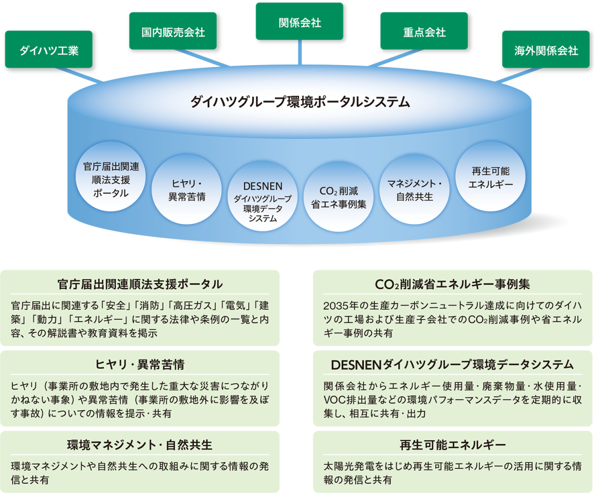 ダイハツは、ステークホルダーの一部である関係会社※1とのコミュニケーションを強化し、環境アクションプランの目標達成に向けて取組みを一層推進していくため、環境に関するあらゆる情報を共有できるインフラを構築しています。このインフラ上には、関係会社の環境パフォーマンスデータを共有するDESNEN※2(ダイハツグループ環境データシステム)や官庁届出関連順法支援ポータル、さらに、環境ヒヤリ・異常苦情やCO2削減省エネ事例、環境マネジメント・自然共生、再生可能エネルギーに関する情報をダイハツおよび国内関係会社で相互発信して共有できる仕組みが設けられ、必要な知見を容易に入手できる環境を整えています。このシステムの運用により、人手に依存していた環境パフォーマンスデータの収集の効率化や、各情報のライブラリ化が実現でき、環境への取組みの質の向上にもつながっています。今後、海外関係会社にもシステム展開を予定しています。