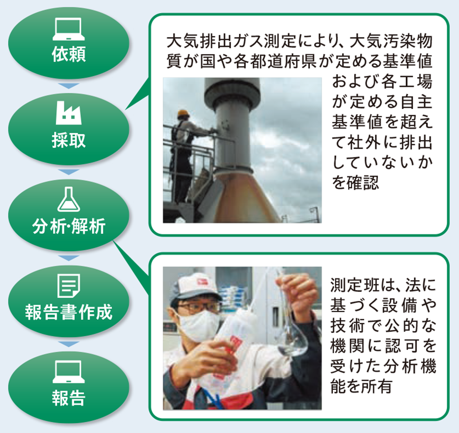 ダイハツは、水・大気・土壌中の汚染物質の濃度などを正確に計量し、その結果を公的に証明することのできる「環境計量証明事業所」として大阪府に登録しています。社内の環境測定担当部署がその役割を担い、ダイハツの企業活動※によって発生する各種の排出ガスや、排水の中に含まれる有害物質が法定の基準値を超えないよう、サンプリングと化学分析を行い、各事業所と連携しながら環境異常の未然防止に努めています。また、従業員の健康を守るため、有資格者による作業環境測定も行っています。