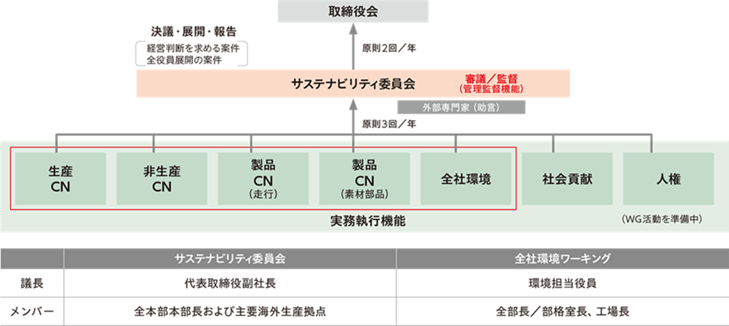 代表取締役副社長が議長を務め、各本部長や監査役などをメンバーとする「サステナビリティ委員会」のもと、全社の環境マネジメント強化を図っています。環境保全活動の執行を担う「全社環境ワーキング」と連携し、「第7次ダイハツ環境取組みプラン」で掲げられた環境マネジメントに関する取組み項目に注力しています。