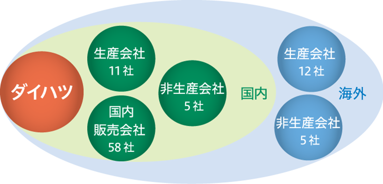 ダイハツの企業活動によって生じる環境負荷は子会社や取引先様も含んでおり、グループ全体での環境保全活動を実施する必要があります。資本関係と業種により、関係する会社を下図のようにグループ分けし、ダイハツグループ全体の環境面でのマネジメントを推進しています。具体的な施策としては、グループ各社との情報交換の場として、原則毎年2回グループ環境連絡会を開催し、各種環境情報の共有と相互研鑽を推進しています。今後は国内重視から、グローバル環境会議に拡大していきます。