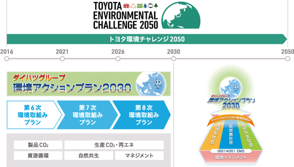 トヨタグループの一員として、2050年に向けた長期目標は「トヨタ環境チャレンジ2050」を共有しています。「ダイハツグループ環境アクションプラン2030」は、その中間年(2030年)に向けたダイハツならではの取組みであり、このプランに沿って低炭素社会、循環型社会、自然共生社会の実現を目指す活動を推進しています。