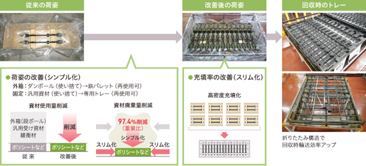 高い充填率および再使用可能な基本条件を満たしたうえで、さらなる軽量化を狙い、ドライブシャフト専用トレーの開発・使用により、ドライブシャフト梱包資材の廃棄物の量を97.4%(重量比)削減しました。