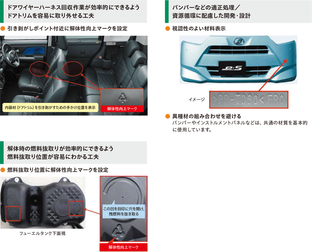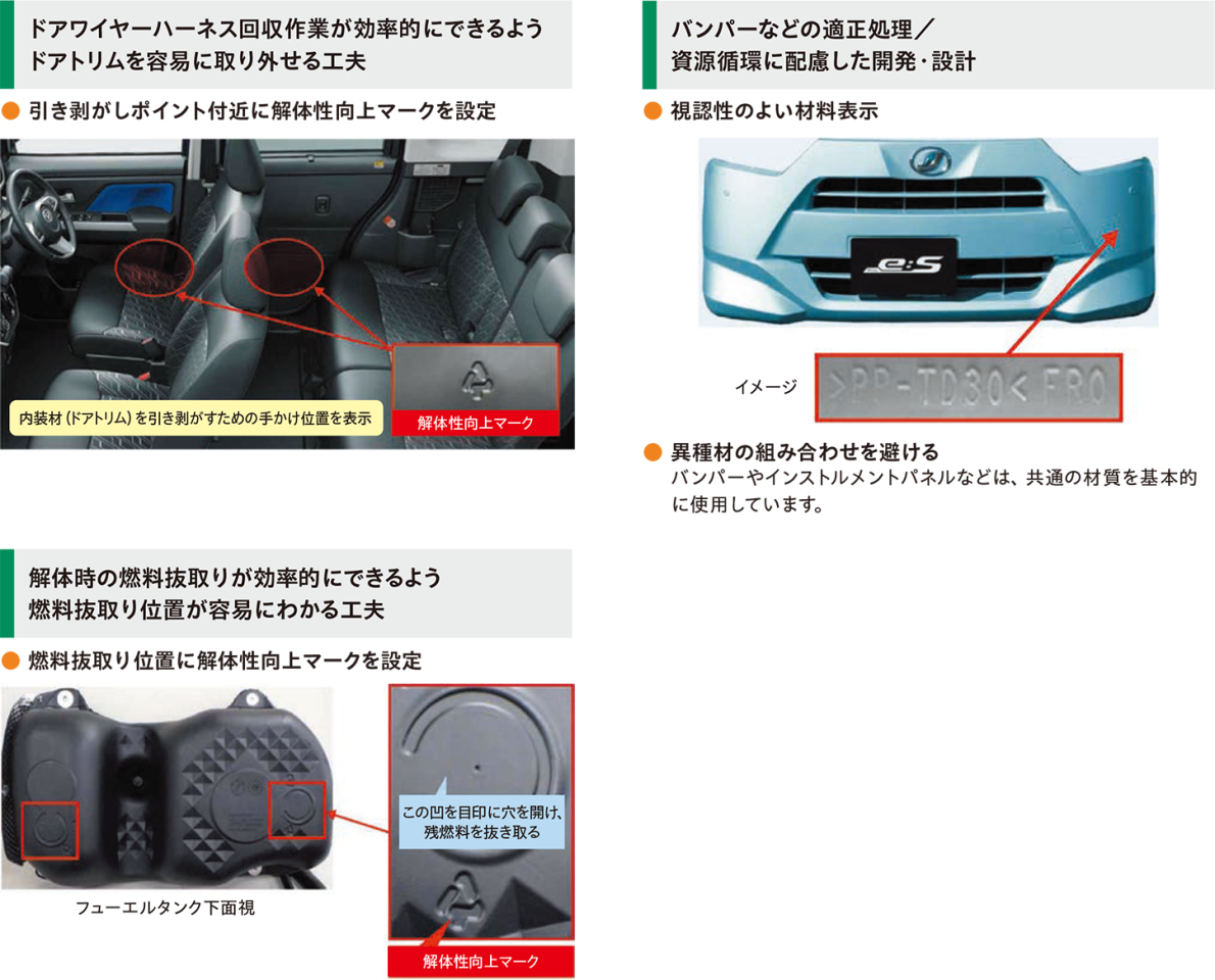 日本の自動車リサイクル法では、ユーザー・政府・解体業者・処理業者・自動車メーカーの緊密な「連携」によって、車両の99%がリサイクルされています。自動車メーカーが、あらかじめ解体しやすい設計にしておくこと(=リサイクル設計)もその「連携」の一つで、分別回収による資源循環の一助となります。