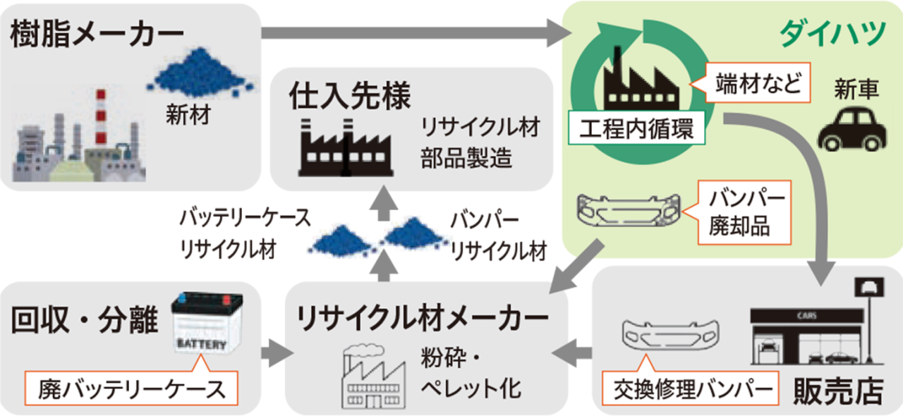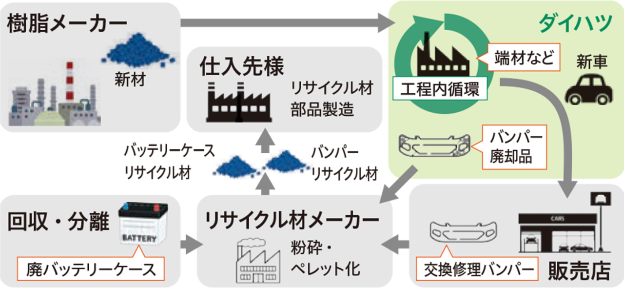 リサイクルに適したプラスチックである熱可塑性樹脂の開発を進め、自動車製造に必要な材料の統合化を図り、材料種類の削減に取り組んでいます。