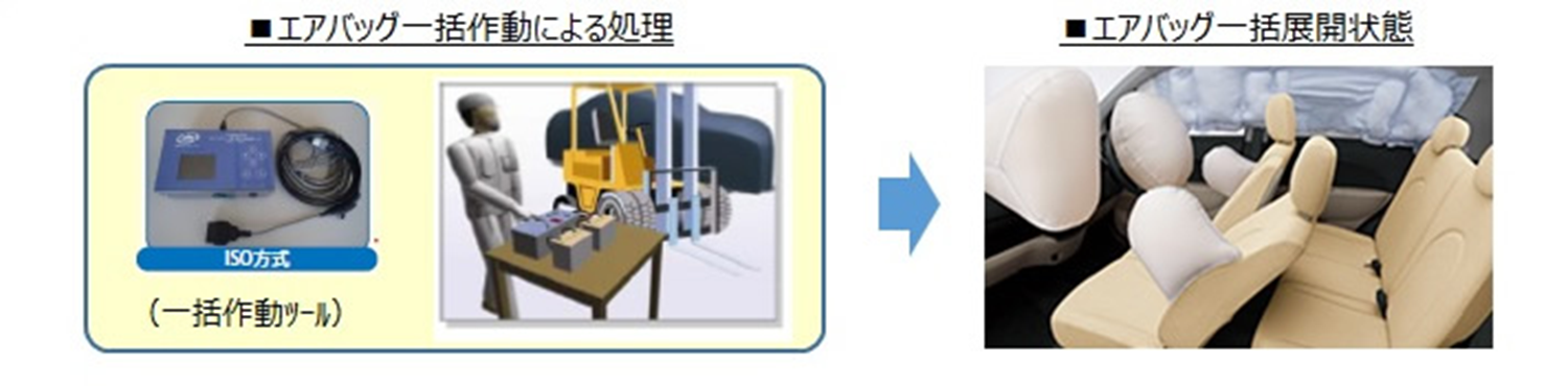 エアバッグ類を取り外すことなく、容易に車載状態で作動処理させるため、エアバッグ類一括作動処理コネクターを全車に搭載しています。エアバッグ類の安全、容易な解体、作動方法を示した 「エアバッグ類適正処理マニュアル」を、登録解体業者向けにWebにより公開しています。