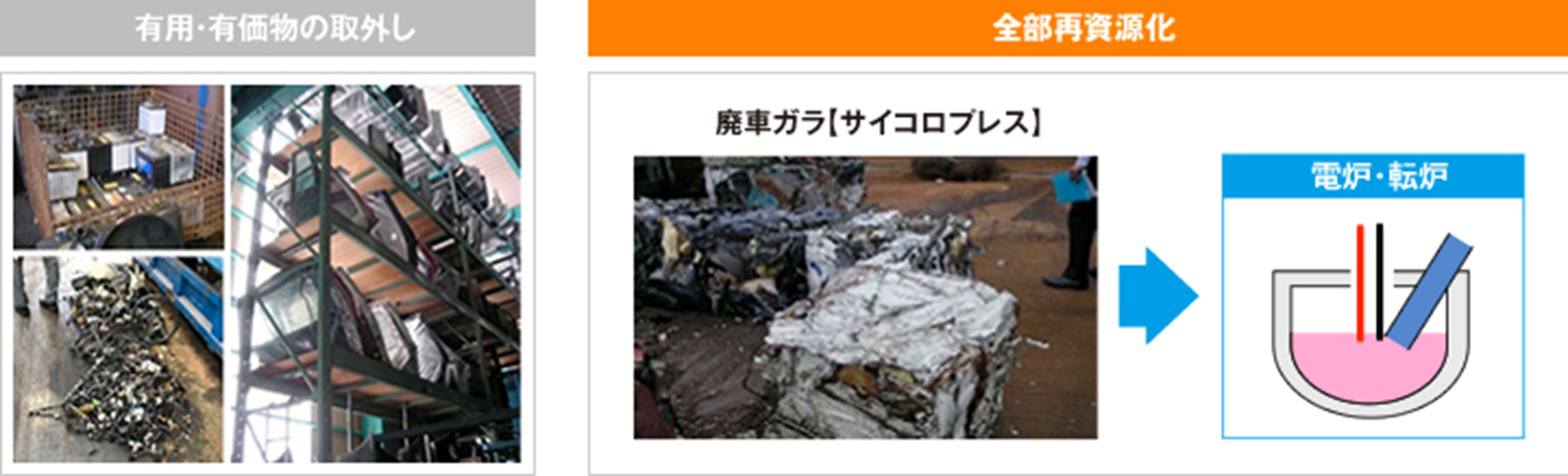 エアバッグ類、フロン類については、共通引き取り窓口機能として設立された一般社団法人自動車再資源化協力機構を通じて、効率的な引き取り、リサイクル(フロン類については破壊)を実施します。シュレッダーダストについては、豊通リサイクル株式会社ASR再資源化事業部の設立に参加し、トヨタ自動車株式会社、本田技研工業株式会社、日野自動車株式会社と共同で、引き取り、リサイクルを実施しています。