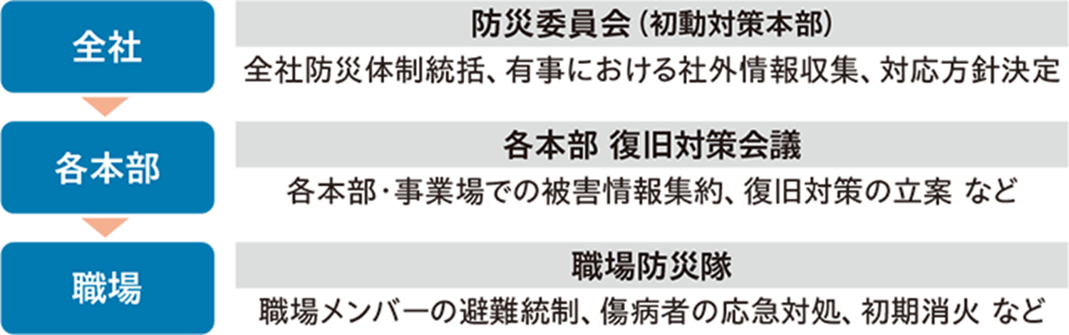 災害などの緊急時の危機管理を適切に行うため、全社レベル・各本部レベル・職場レベルの3階層で役割を定めて初動体制を構築しています。また、全社初動対応訓練や安否システムを活用した安否確認訓練をグループ会社連携で行うことで、初動の精度と実効性の向上に努めています。