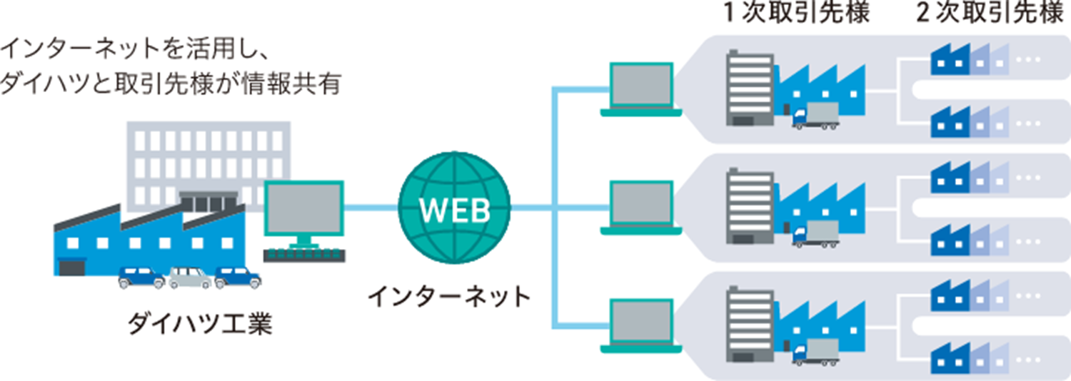 災害時の復旧支援の早期化・迅速化を図るために、取引先様と一体となった災害に強いサプライチェーンの構築に努めています。平時からSCRK※システムの構築によってサプライチェーン情報を「見える化」し、災害に備えた対策を推進しています。具体的には取引先様からご提供いただいた情報をもとにデータベースを構築し、災害時に被害の把握や支援要否などの確認に活用しています。