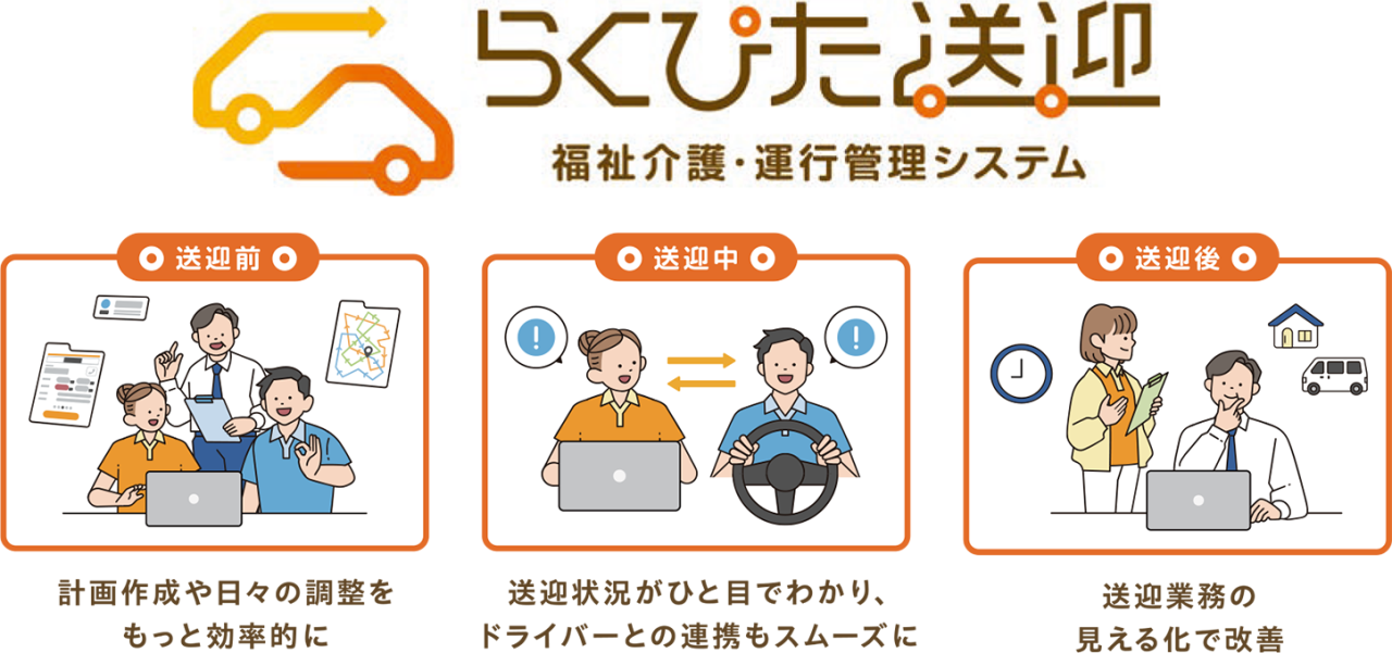 ダイハツは、お客様や地域の方々に寄り添ったソリューションの提供にも取り組んでいます。その活動の一つが通所介護施設(デイサービスなど)向けの福祉介護・運行管理システム「らくぴた送迎」です。通所介護施設の送迎業務は施設業務の約3割を占める状況にあり、介護職員の約6割が心理的負担を感じています。「らくぴた送迎」はクラウドシステムとスマホアプリにより従来の属人的でアナログな送迎業務を変え、送迎前・送迎中・送迎後の各シーンのお悩みを解決することで介護現場の生産性向上に寄与するサービスです。送迎計画担当者・ドライバー・管理者、そしてご利用者様とそのご家族が喜ぶ送迎の実現をお手伝いし、すでに全国各地の多くの施設でご活用いただいています。