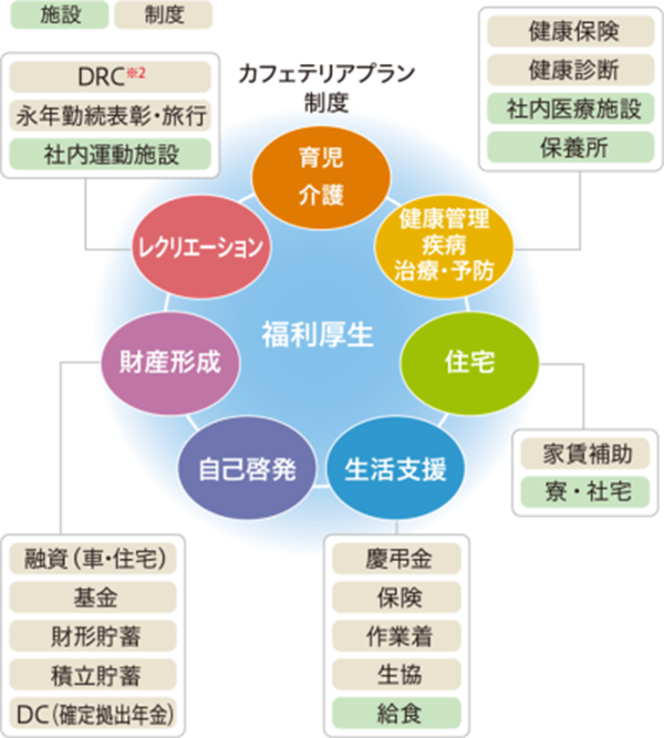 ダイハツは、「笑顔の会社、働きたい会社No.1」の実現に貢献するため、安心して働ける施設・設備の充実や、すべての世代の従業員が「あってよかった」と感じる生活応援施策の充実、多様化する個々人の嗜好に沿った選択肢の拡大に取り組んでいます。また、福利厚生制度を適切に利用できるよう、わかりやすい制度設計・整備と、従業員の福利厚生リテラシー向上にも注力しています。