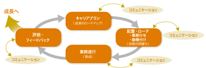 具体的には、年度初めに上司と部下が十分に話し合い、認識をすり合わせたうえで期待役割などを設定します。そして、期末にその期待役割に対する能力発揮状況を上司と部下がともに振り返り、次の期間に向けてどのような考動をして何を伸ばしていくかを考えます。このようなコミュニケーションを通じて、個々人の成長を促進しています。