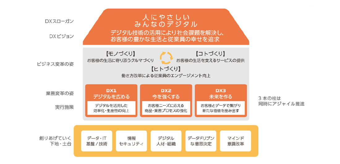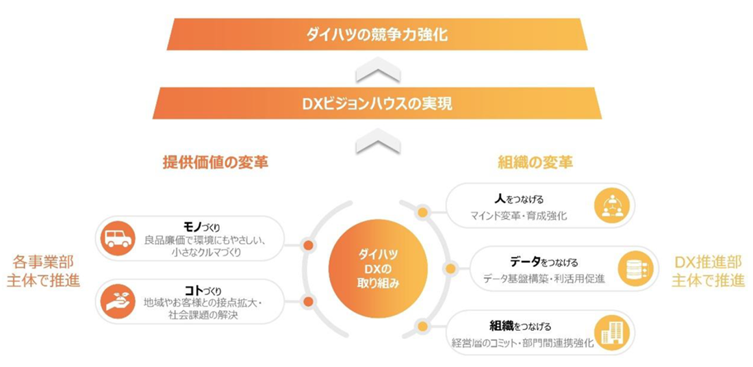 ダイハツは「人にやさしい、みんなのデジタル」をスローガンとして掲げ、従業員が自らデジタルを学び、実装することで、デジタル技術の活用による業務効率化や変革を行うとともに、各部門でデジタル活用を重点課題として管理し、経営層と共通認識を持ちながら課題解決に取り組む、トップダウンとボトムアップ双方向からの全社DX化を推進しています。