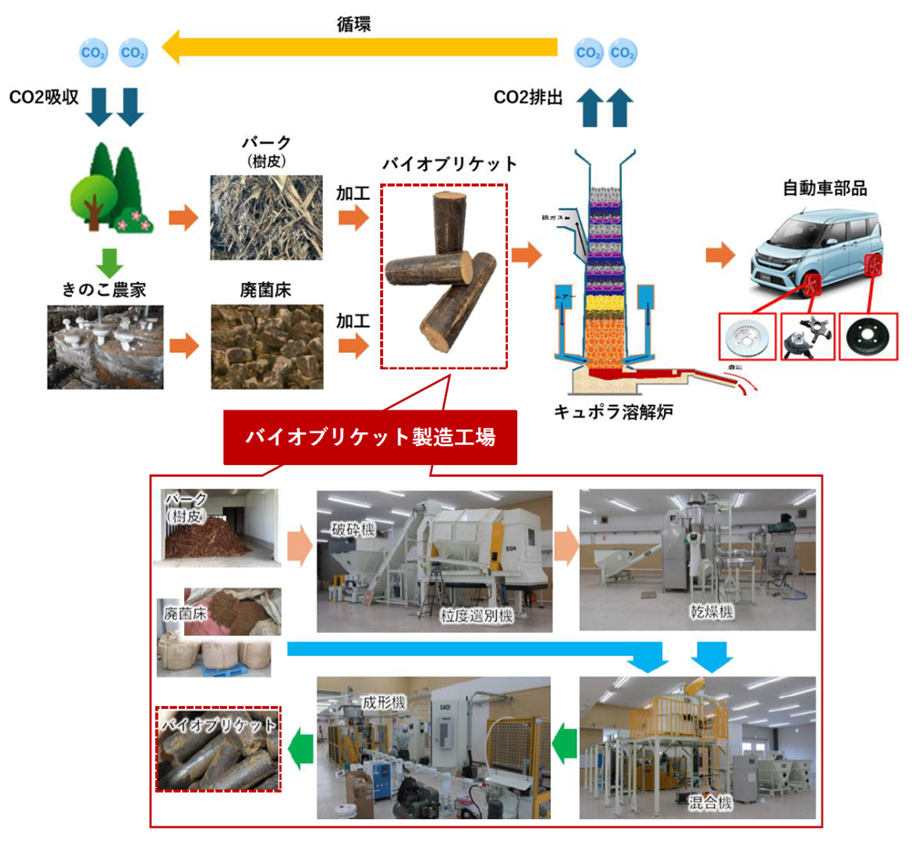 株式会社ダイハツメタル(以下、ダイハツメタル)は、ダイハツ工業株式会社(以下、ダイハツ)と共同でカーボンニュートラルなバイオマス燃料である「バイオブリケット※」の製造技術を開発・確立し、ダイハツメタル出雲工場の鋳造設備であるキュポラ溶解炉(以下、キュポラ)での使用を開始しました。