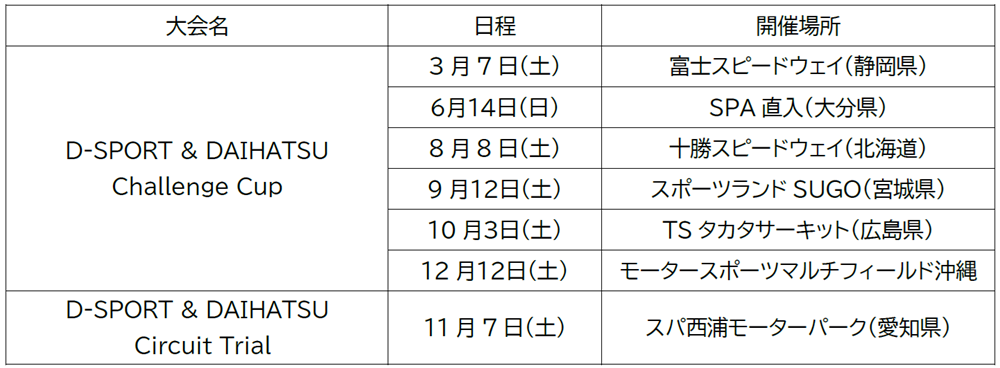また、モータースポーツのすそ野を広げる取り組みとして、ダイハツ車ユーザーであればだれでも気軽に安全にサーキット走行を楽しんでいただける「D-SPORT & DAIHATSU Challenge Cup※1」を全6か所で開催予定です。また、「JAF国内Aライセンス」取得資格が得られる「D-SPORT & DAIHATSU Circuit Trial」も開催いたします。これまでの挑戦で得た知見を最大限に活用し、これからもダイハツ車の楽しさ、面白さなどをエンドユーザー、マーケットへ伝え続けるべく、モータースポーツ活動を継続してまいります。