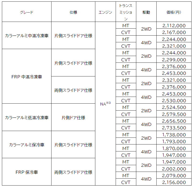 (価格は希望小売価格であり、参考価格です。価格は販売会社が独自に定めますので、詳しくは販売会社にお尋ねください。保険料、税金(消費税を除く)、自動車リサイクル料金、登録等に伴う費用等は別途申し受けます。)