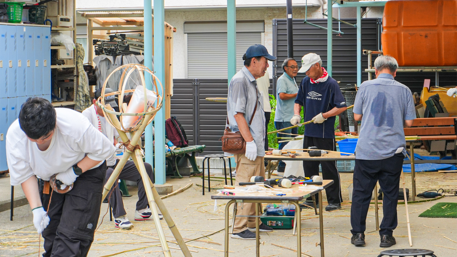 「いけだ夢燈花」の当日に会場を彩る竹灯籠づくりのため、8月23日、ダイハツ皐月会池田第1・第2支部の皆さんとダイハツ労働組合青年部の皆さんが集まりました。