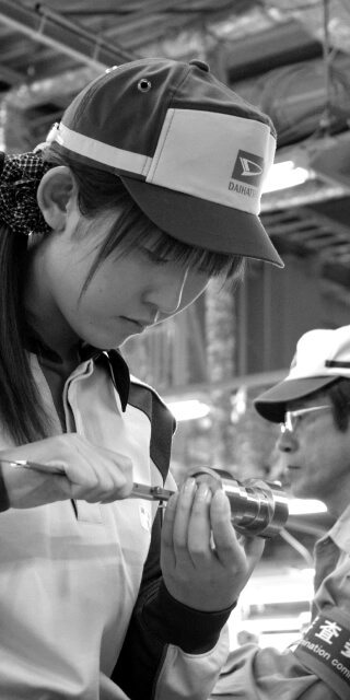 ダイハツが求めているのは、タフ(Tough)で、マルチ(Multi)で、グローバル(Global)な人の力。TMGな人材だ。成功するまでやりきる人。やるべき事を部門を越えて自ら実践する人。世界のどこでも活躍できる人。そうした人材の基礎を育むために、ダイハツでは、クルマづくりに関する専門知識や高度な技術を身につけられるよう、教育体系・研修制度を充実させている。