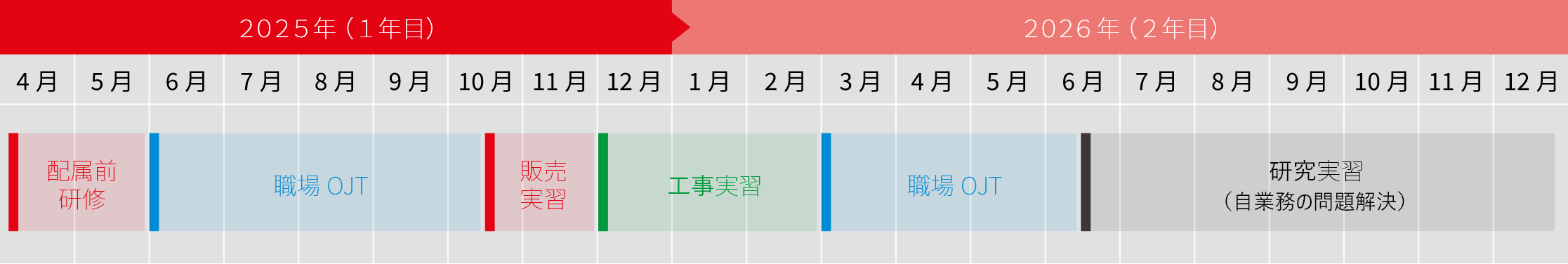 配属を安心して迎えるため、社会人としての基礎、当社の価値観・ものづくり、配属を想定した実践を用意しています。