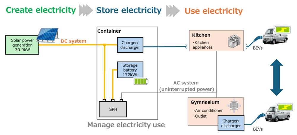 In addition, the SPH and storage battery are compactly housed within the same container. This enables transportation to areas affected by disasters, where they can supply power using local renewable energy sources such as solar and wind power. Furthermore, by utilizing BEVs as mobile storage batteries, electricity can be shared between containers and multiple buildings. The data and knowledge gained through this experiment will form the foundation for developing an effective service.