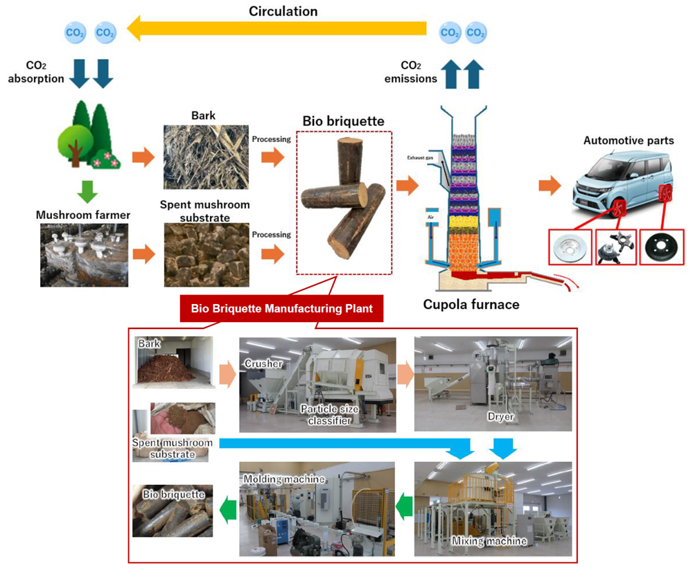 Since 2024, Daihatsu Metal has jointly conducted research on bio briquettes using regional resources such as spent mushroom substrate and bark as a biomass fuel to replace coke derived from coal. Now, using the technology established by Koyama Co., Ltd., a member of the working group, the company has established a manufacturing plant. In addition, by collaborating with local governments and companies in the region, Daihatsu Metal has created a system that can stably procure resources from the region and constructed an integrated energy circulation model that covers everything from resource procurement to manufacturing and utilization of biomass fuel.